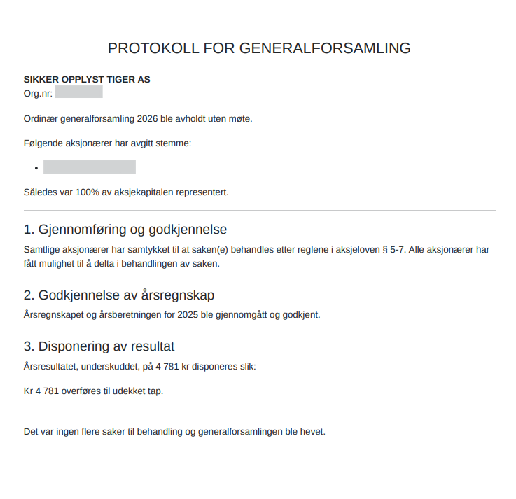 Når du leverer årsregnskapet med Luca, genererer vi en ferdigstilt protokoll for deg som følger lovens krav. Så lenge alle aksjonærer ønsker en forenklet generalforsamling, kan du levere og arkivere denne med årsregnskapet.