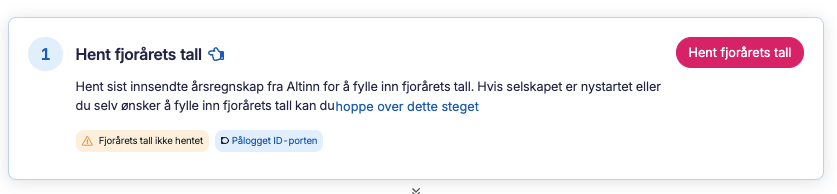 For at årsregnskapet skal inneholde sammenligningstall, kan du hente siste innsendte årsregnskap fra Altinn via ID-porten. Er selskapet nystartet, kan du hoppe over dette steget.