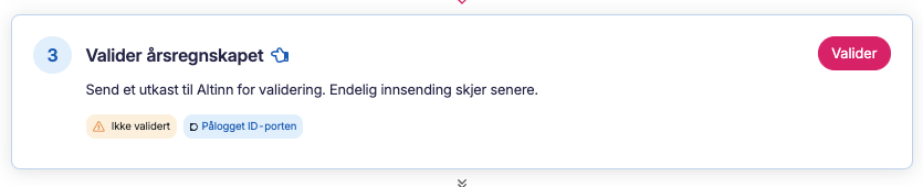 Trykk Valider for å sende et utkast til Altinn for kontroll. Selve innsendingen skjer først i siste steg.